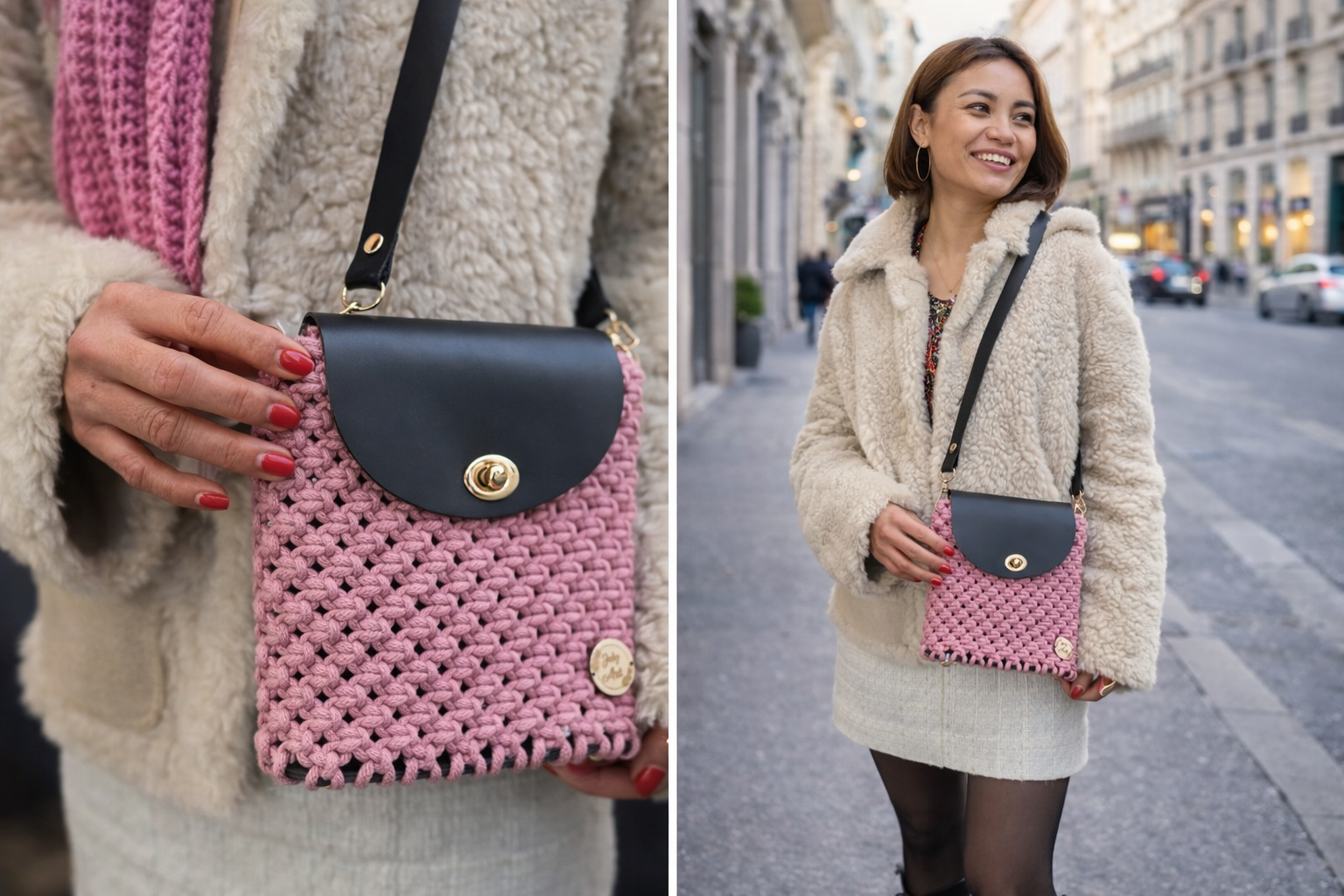 Un équilibre parfait entre élégance urbaine et charme artisanal : ce sac crocheté à la main en rose poudré, sublimé par un rabat noir satiné et une fermeture dorée, est votre nouvel allié de style !