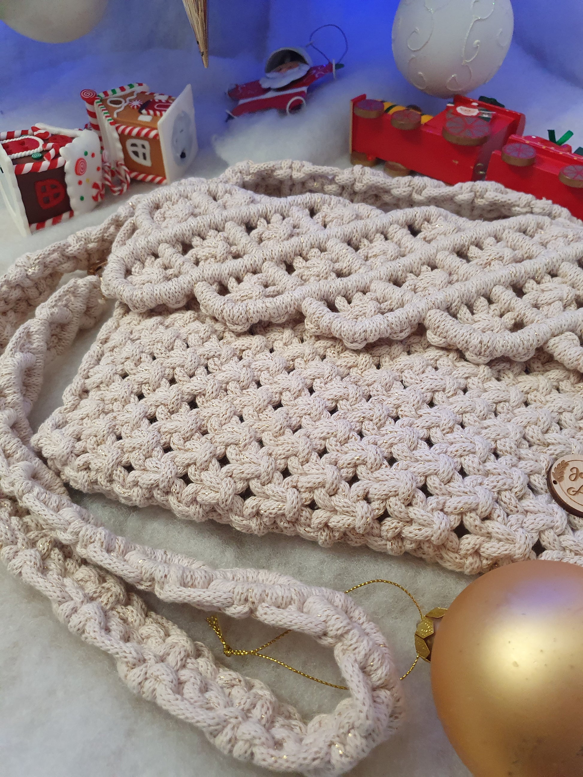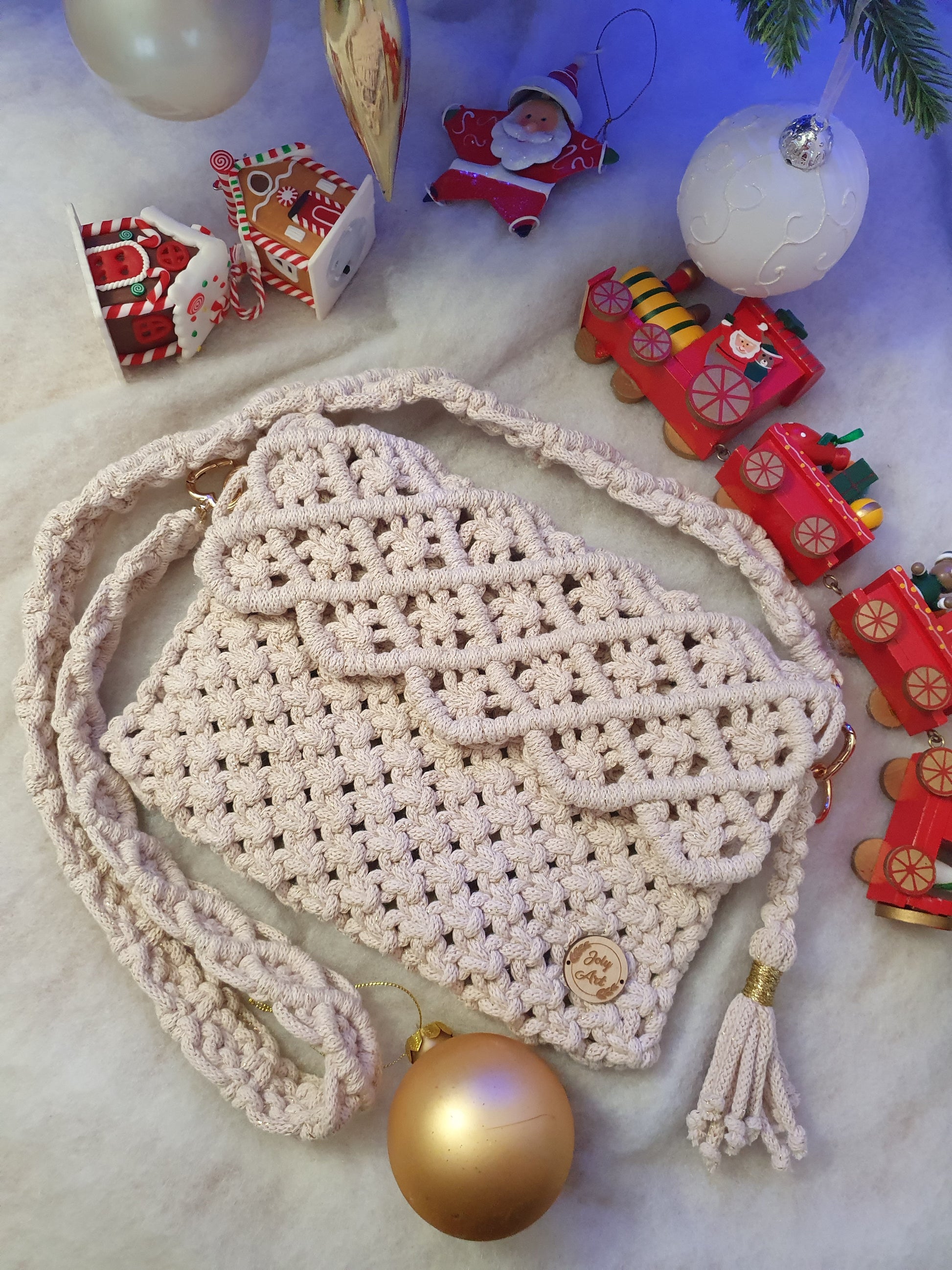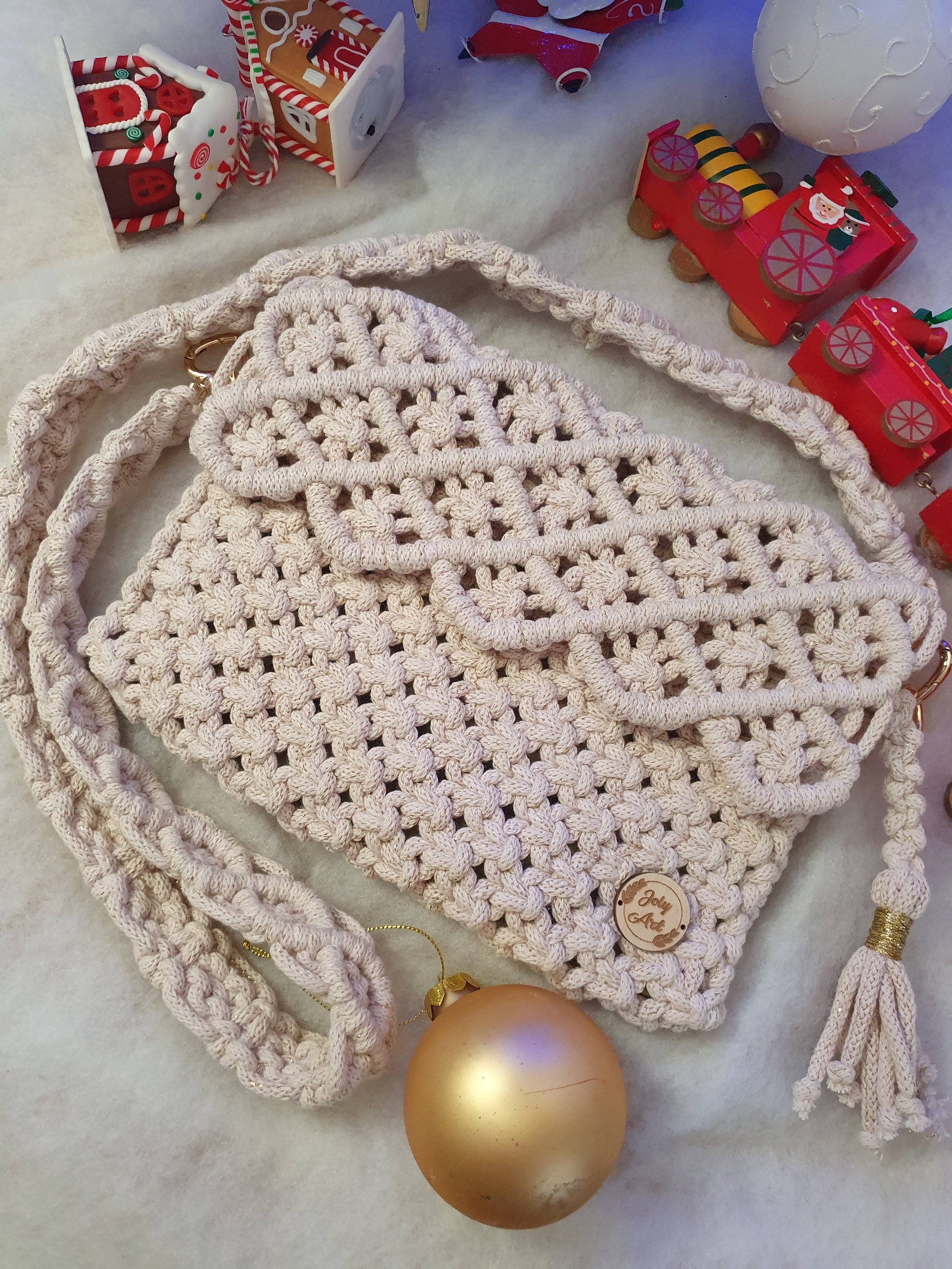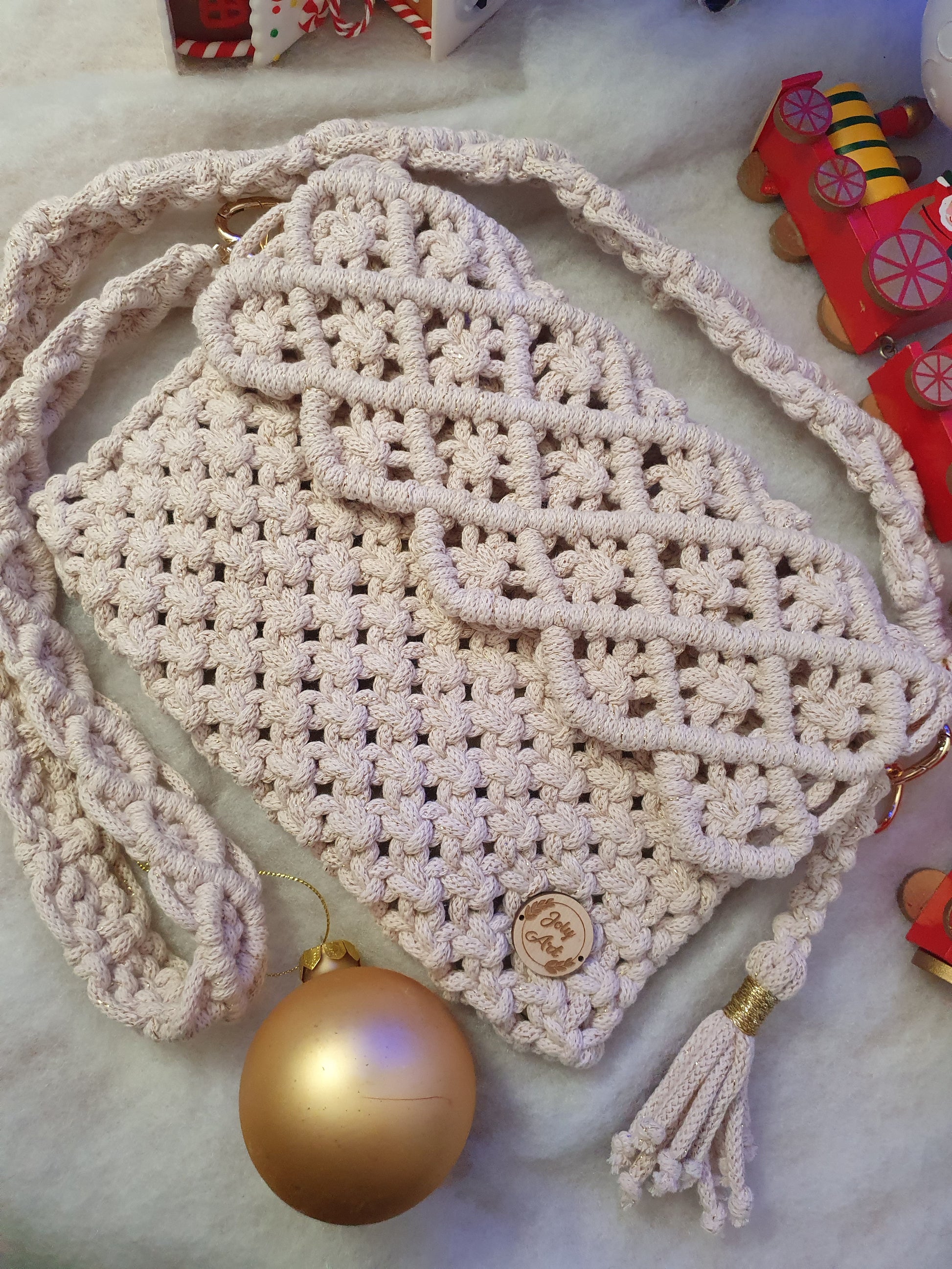 Le sac bandoulière en macramé est un accessoire délicat et élégant, parfait pour ajouter une touche bohème et sophistiquée à vos tenues. Tissé à la main avec des fils de coton et une doublure intérieure coton, il présente un motif raffiné de nœuds macramé qui lui confère une texture unique et élégante. La couleur beige, neutre et douce, le rend polyvalent et facile à assortir avec une grande variété de styles, tout en offrant une sensation de chaleur et de naturel.