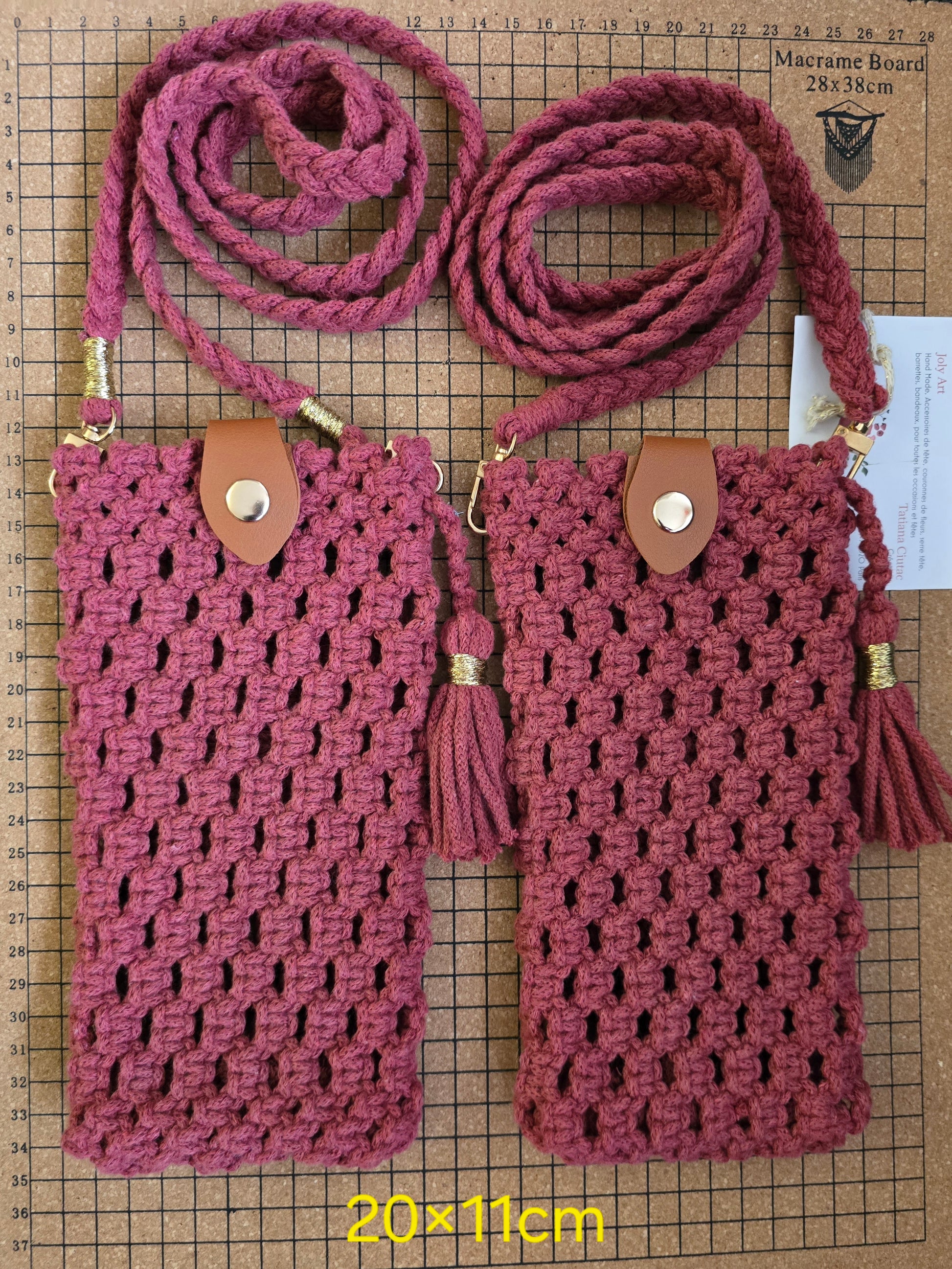 Sac pour téléphone portable de couleurs rouge/maron/brique, confortable et indispensable pour garder son téléphone en sécurité. Réalisé avec du fil 100% eco responsable, technique manuelle artisanale en macramé. Fermeture clips pétanque. Corde tressée d'une longueur standard de 120cm.