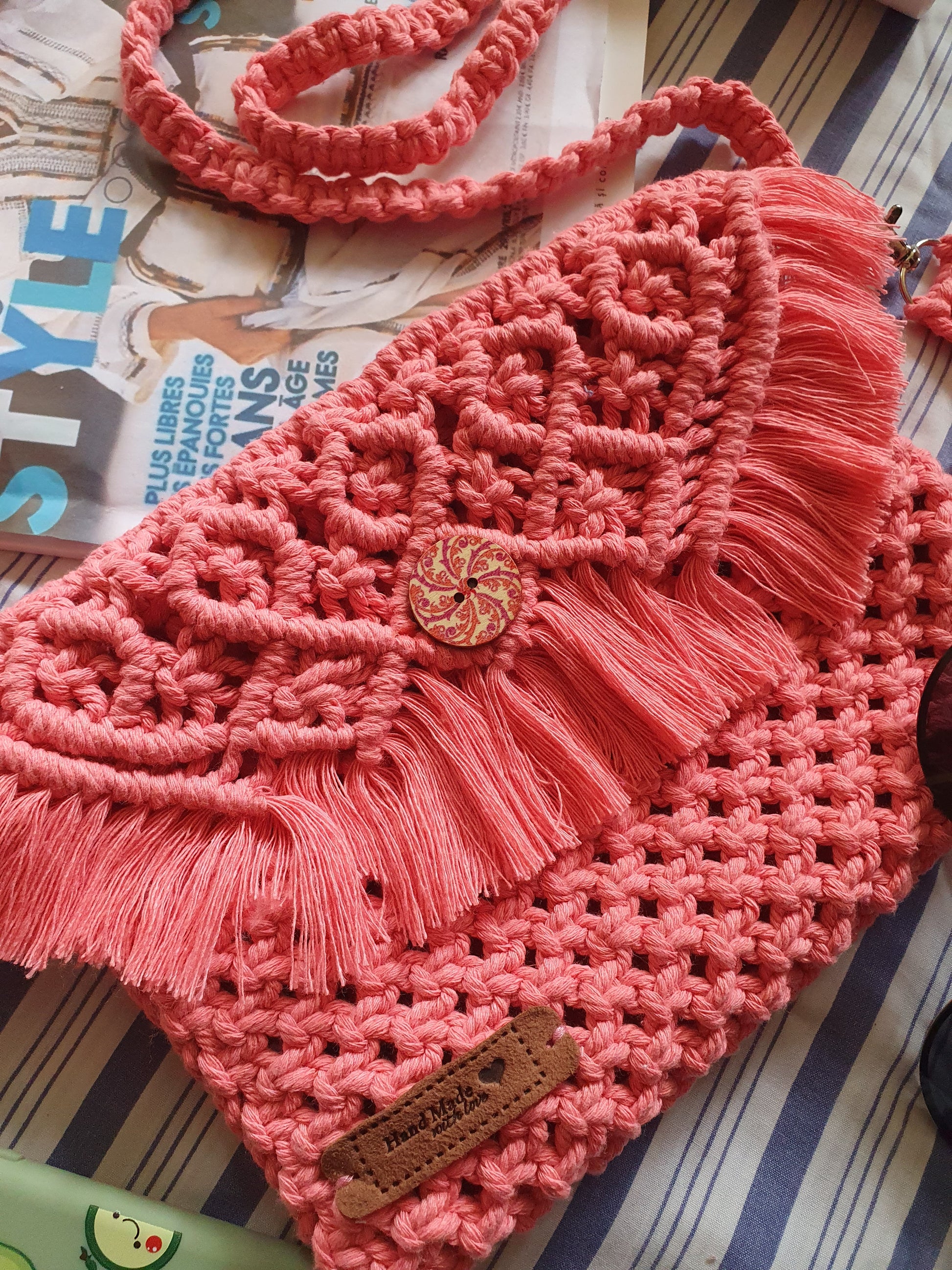 Sac bandoulière de couleur rose, création manuelle artisanale en technique macramé. Fil 100% coton, fermeture bouton magnétique. Acroches poignée métalliques. Article neuf et unique.