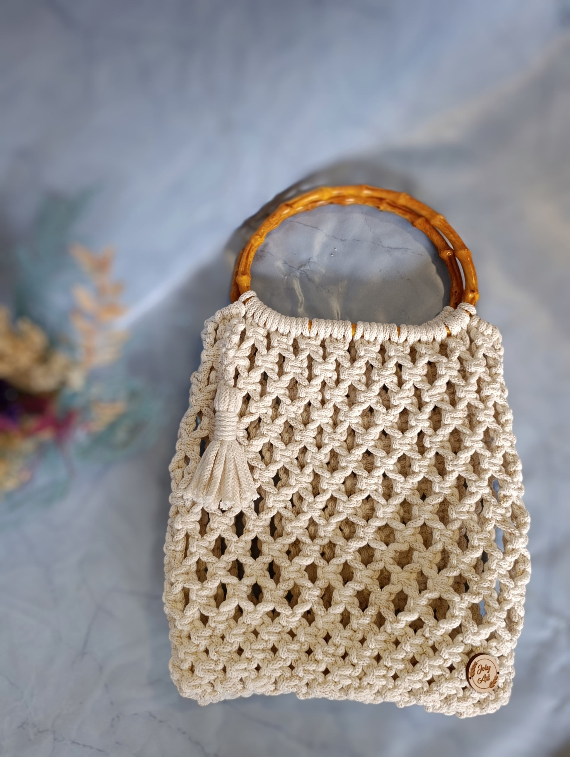 Sac fourr-tout Beige Dorée et Vert Eucalyptus en macramé, un accessoire élégant et original, tissé à la main avec des cordes 100% coton. Il présente un motif complexe de nœuds entrelacés qui forme une texture ajourée et aérée, tout en offrant une certaine rigidité pour maintenir la forme du sac. Les poignées du sac, en forme ronde imitation bambou, sont robustes et confortables, permettant de le porter facilement. Ce type de sac allie artisanat et style, avec une touche bohème et chic. L'accessoire indispensable de cette été !