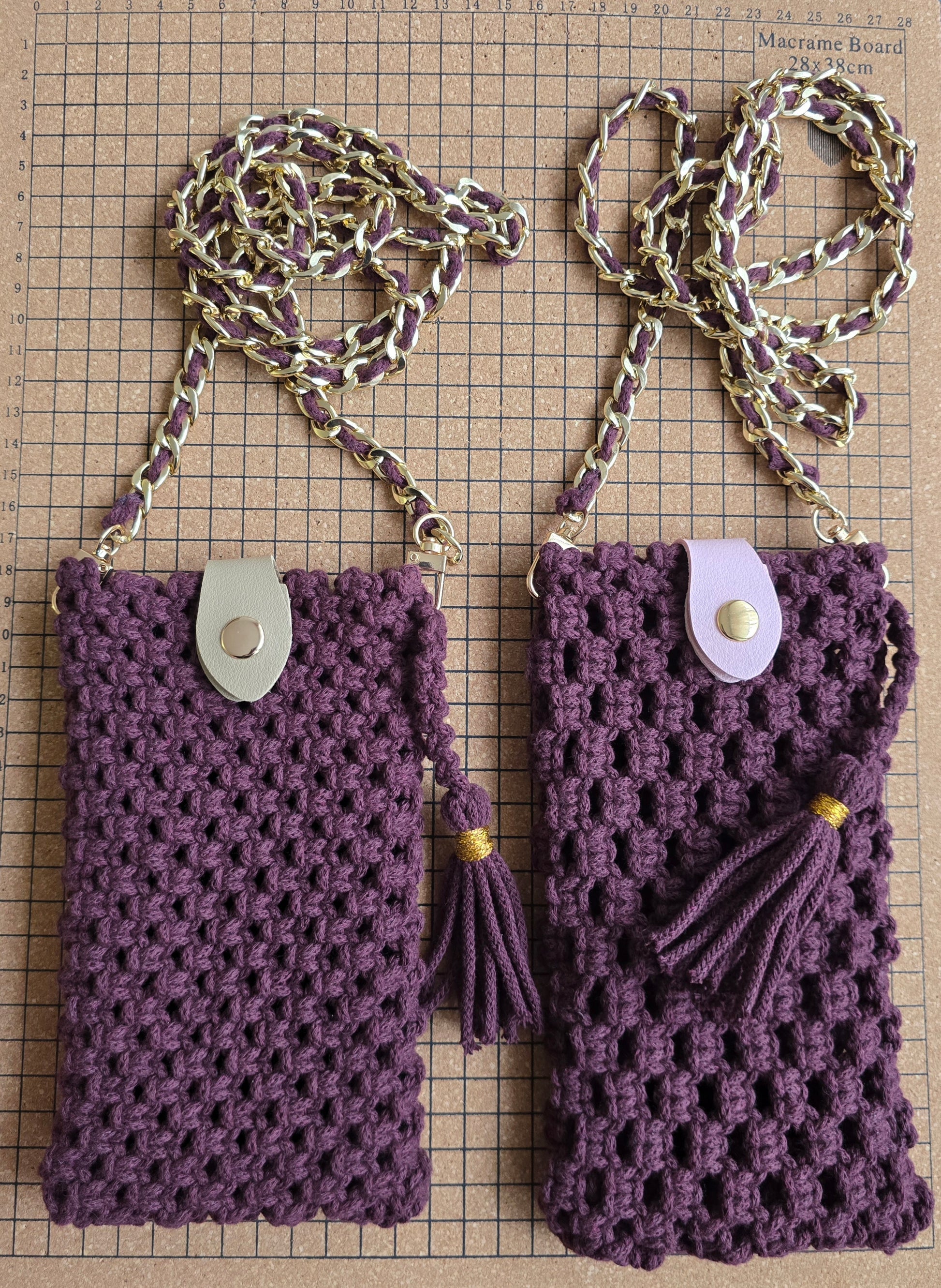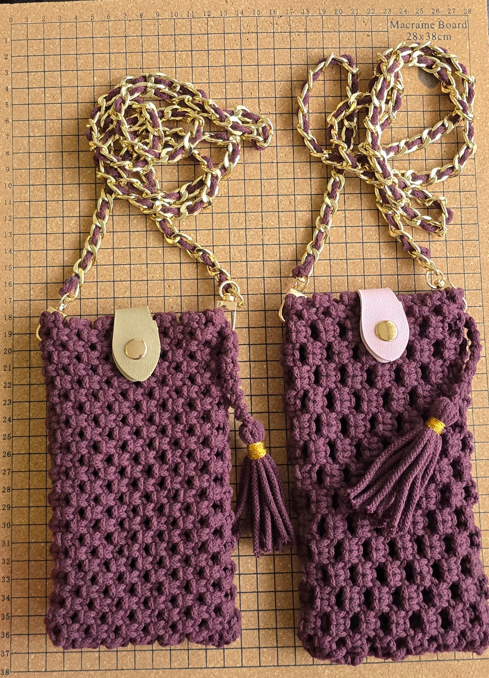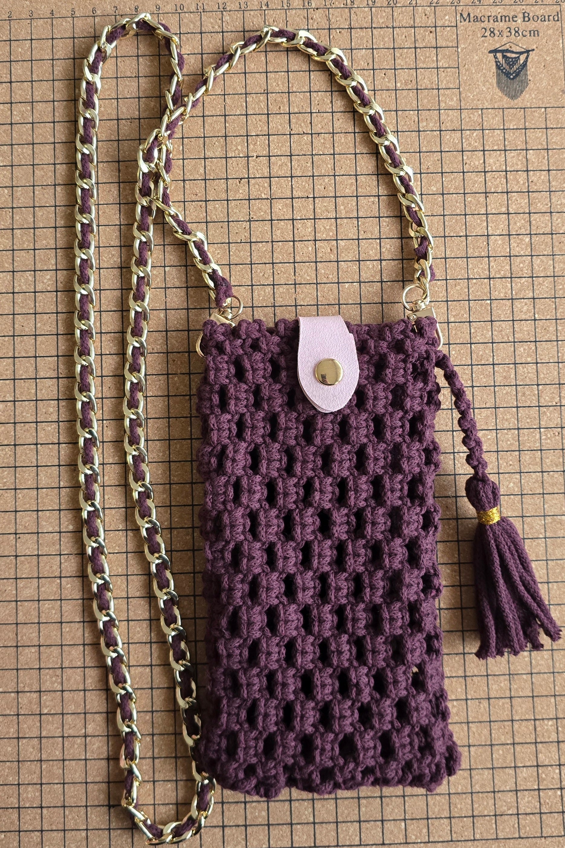 Sac pour téléphone portable de couleurs rouge vin noir, confortable et indispensable pour garder son téléphone en sécurité. Réalisé avec du fil 100% eco responsable, technique manuelle artisanale en macramé. Fermeture clips pétanque. Corde metalique doré d'une longueur standard de 120cm, décorée avec le fil de coton du sac.